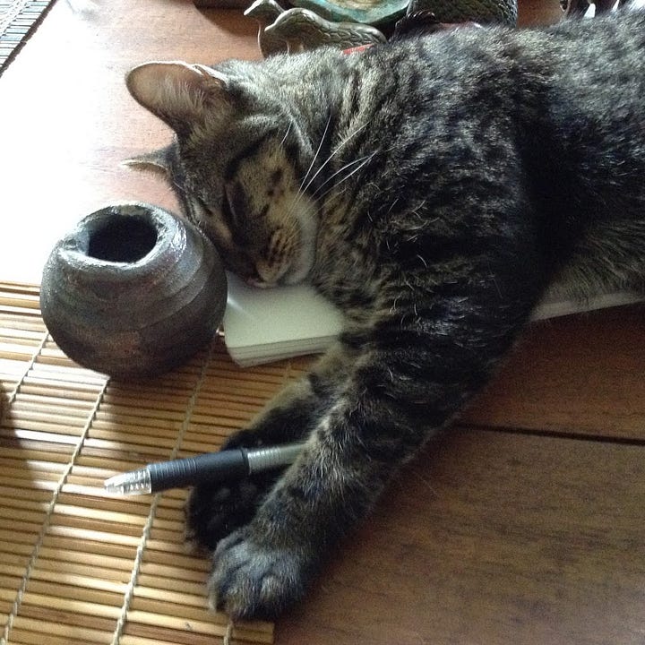 Sushi Cat—my buddy and critic for 10 years in the South. Even on hot nights she would keep me, the laptop, paintings, and supplies well covered with fur.